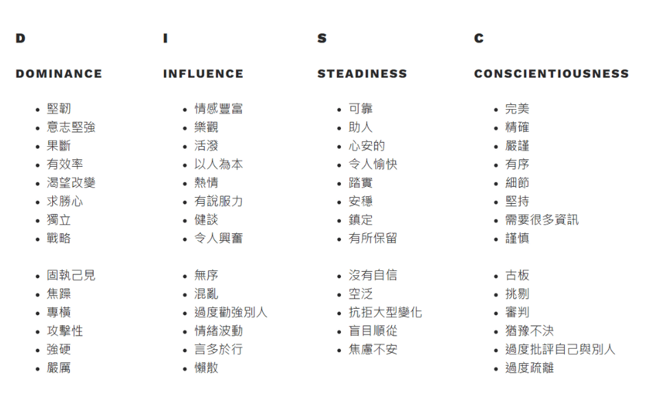 我們每個人其實是多種風格的綜合體,可能在不同情境下表現得不一樣。現在,讓我們看看這張圖片上的形容詞,想一想哪些詞彙最符合你的性格和行為模式。