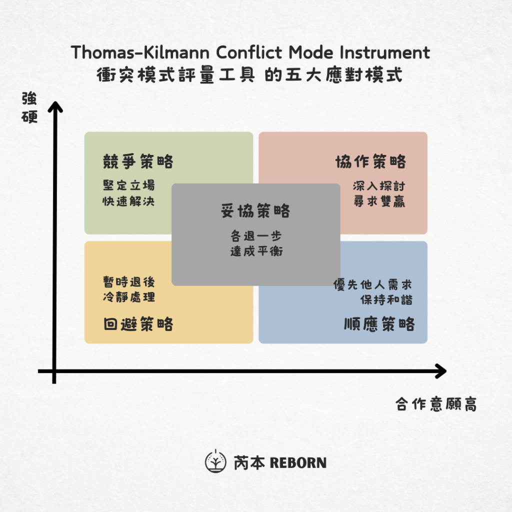 這些模式並非「一體適用」,而是根據具體情境和對象選擇最佳策略。透過 TKI 的五種模式,我們可以避免衝突中常見的過度反應,增強衝突應對的彈性。